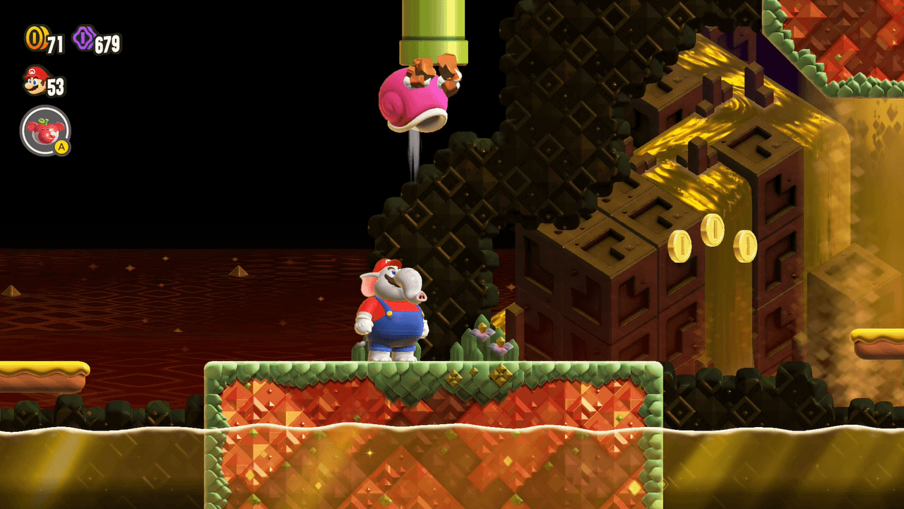 Un peu plus loin, un étrange tuyau jaune sort du haut de l'écran, bloqué par deux blocs marrons. En éléphant, volez la carapace de l'escargot géant juste à gauche et lancez-la en l'air pour casser ces blocs et faire descendre le tuyau.