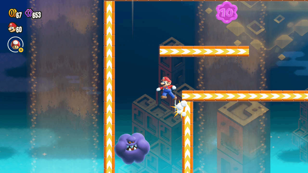 Une fois de plus, la fleur prodige vous transforme en Bondiss ! Sous cette forme, surveillez les petites pièces violettes et sautez à chaque fois que vous pouvez les obtenir.