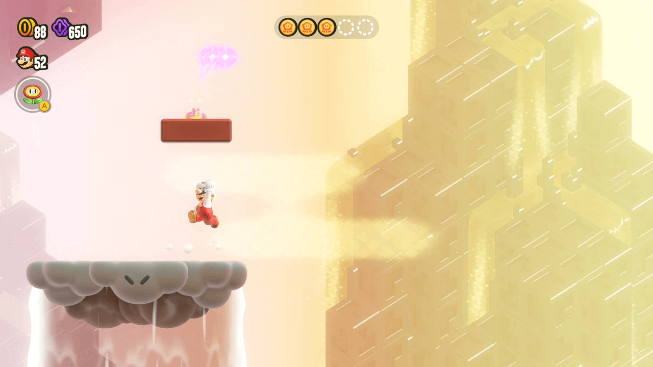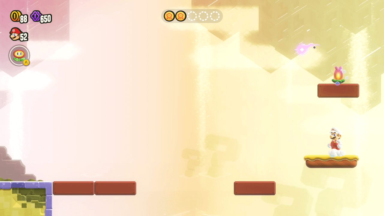Juste au-dessus du premier jeton est caché un autre bloc "?" qui fait apparaitre le deuxième jeton prodige. En haut à gauche de ce deuxième jeton se trouve un autre bloc "?" qui lui fait apparaitre une plateforme.