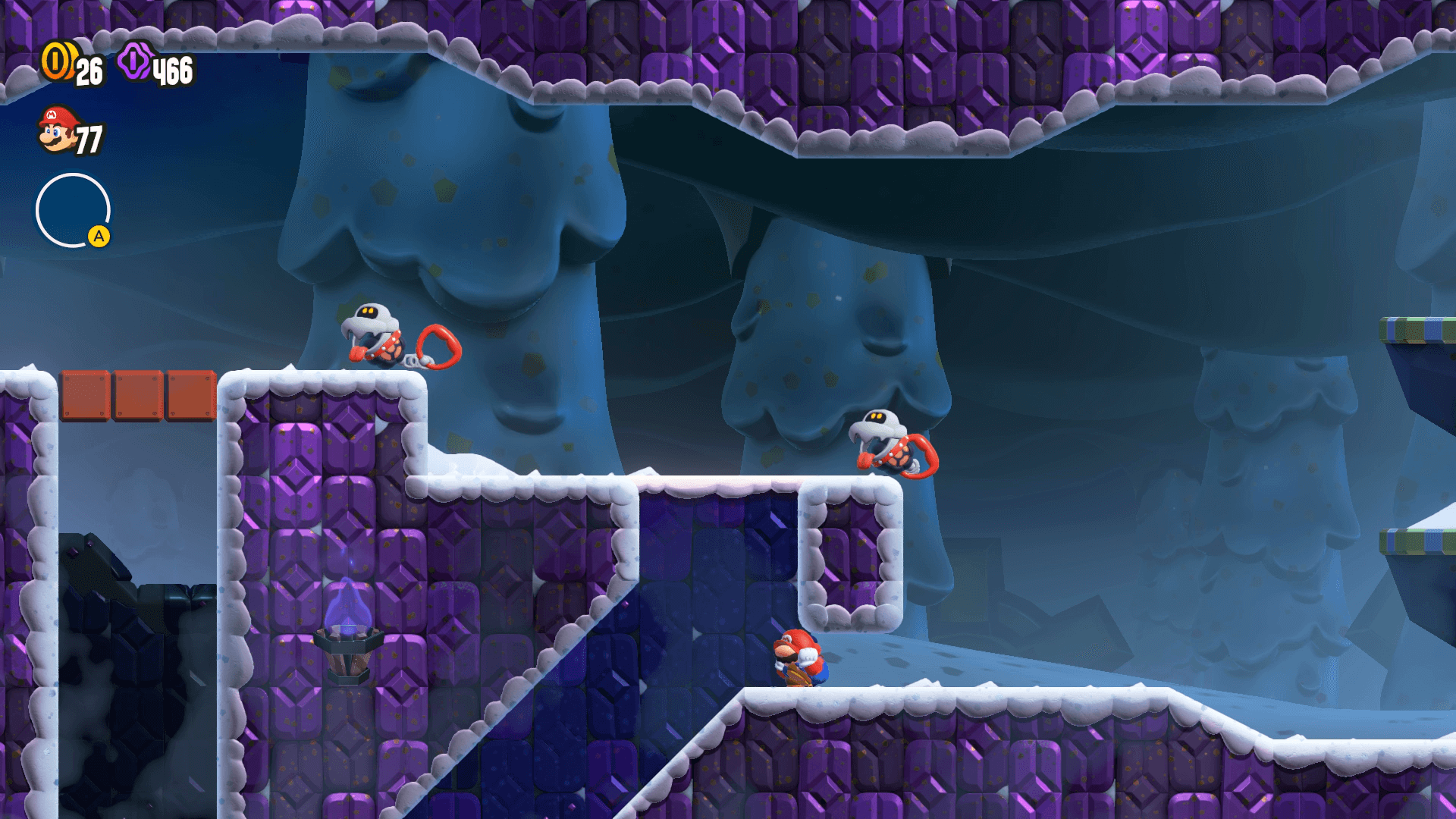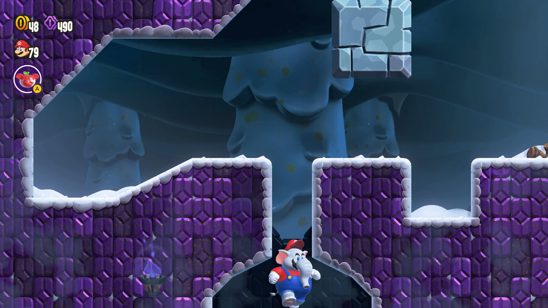 Et pour finir, petit secret bien plus intéressant et rigolo. Juste après le drapeau de mi-niveau, vous pouvez utiliser la boule de pics à droite pour détruire le gros mur de gauche : utilisez le costume de l'éléphant pour se faire.