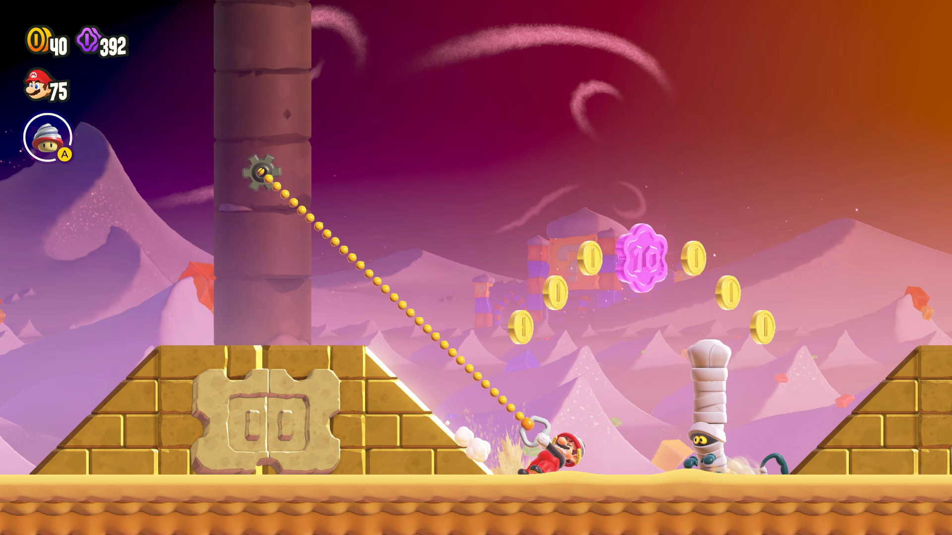 Après le deuxième drapeau de mi-niveau, vous croisez une autre prise au-dessus de la base du sorte de pyramide. Tirez sur cette prise pour faire apparaitre la dernière pièce de 10 fleurs, juste à droite. Attention à la Momito en la récupérant !