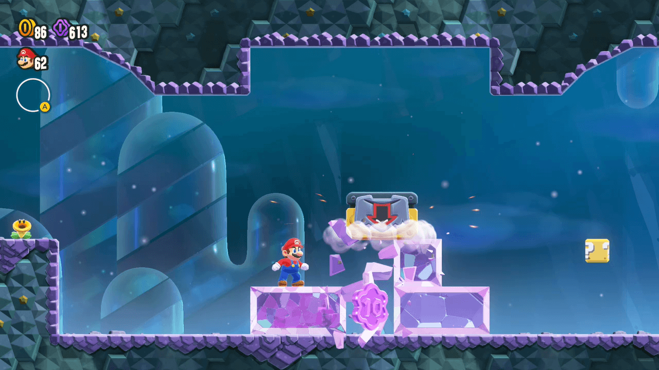 Si vous n'avez plus le costume de la foreuse, il existe un autre moyen un peu plus difficile pour atteindre la pièce : un bloc invisible se trouve en effet vers la droite de la pièce, sous les cristaux. En faisant un saut mural depuis ce bloc, il est possible d'atteindre la pièce depuis sa droite.