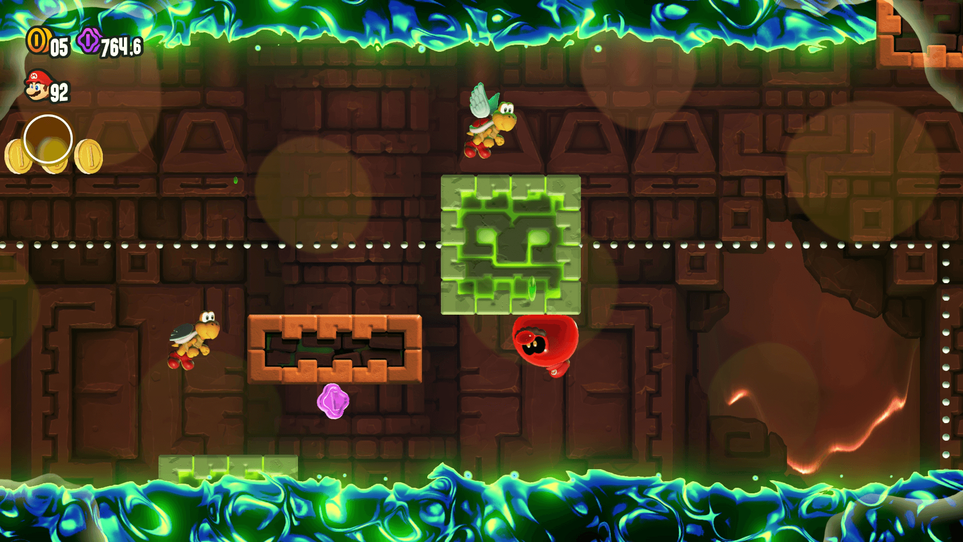 Juste après le deuxième drapeau de mi-niveau, vous pouvez voir un petit bloc de gelée coiné entre deux gros blocs de pierre : faites une charge au sol dessus pour faire sortir la fleur prodige.