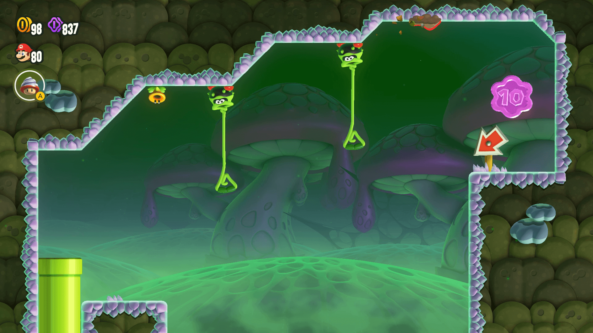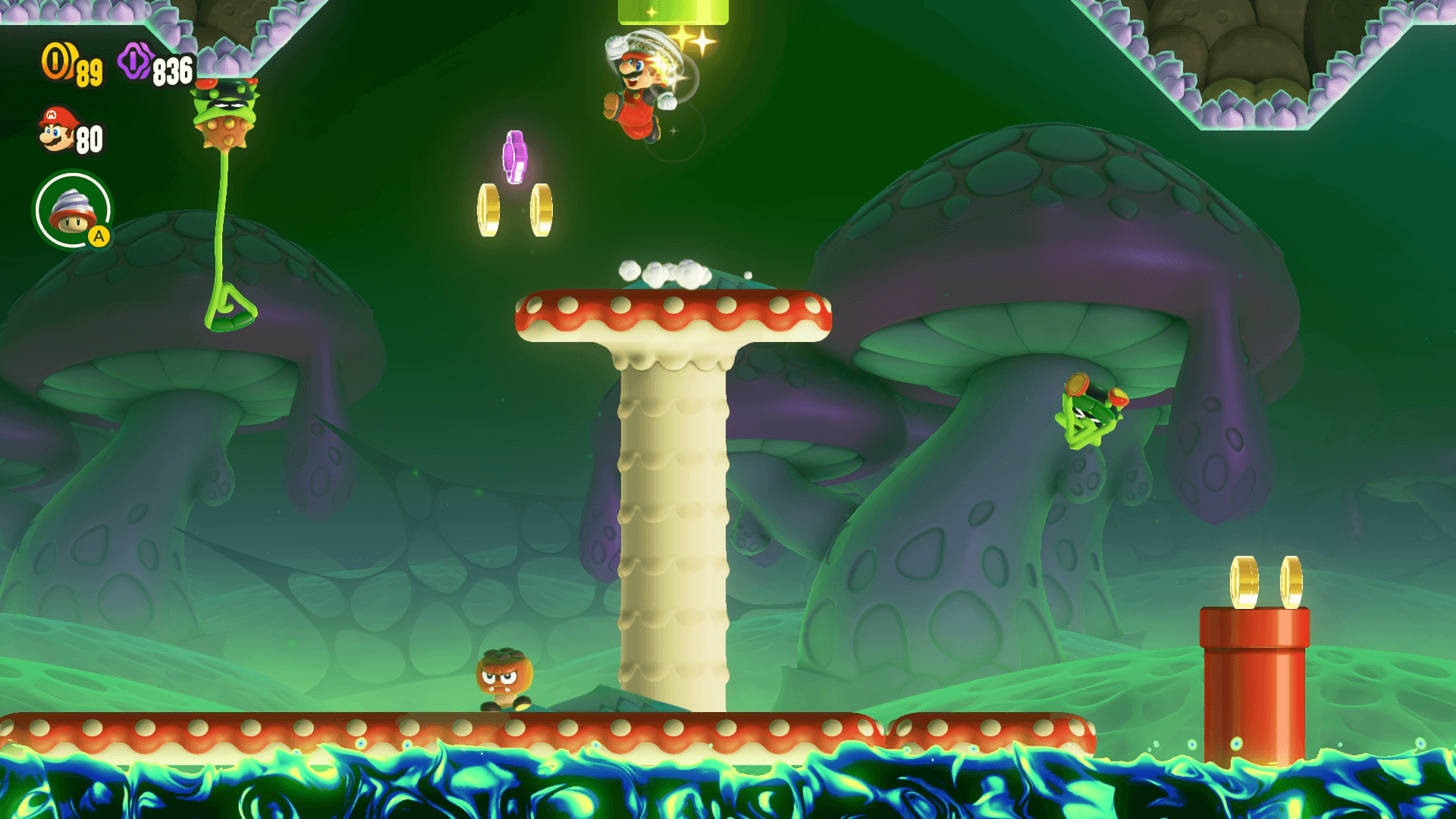 Un peu plus loin, juste avant un tuyau rouge qui sort de l'espèce de poison du bas de l'écran, se trouve un grand champignon rouge entourée de deux Népendars. Accrochez-vous à l'un de ces deux ennemis (ou aidez-vous du costume de la foreuse pour passer par le plafond) pour grimper sur le champignon et découvrir un tuyau vert sortant du plafond.