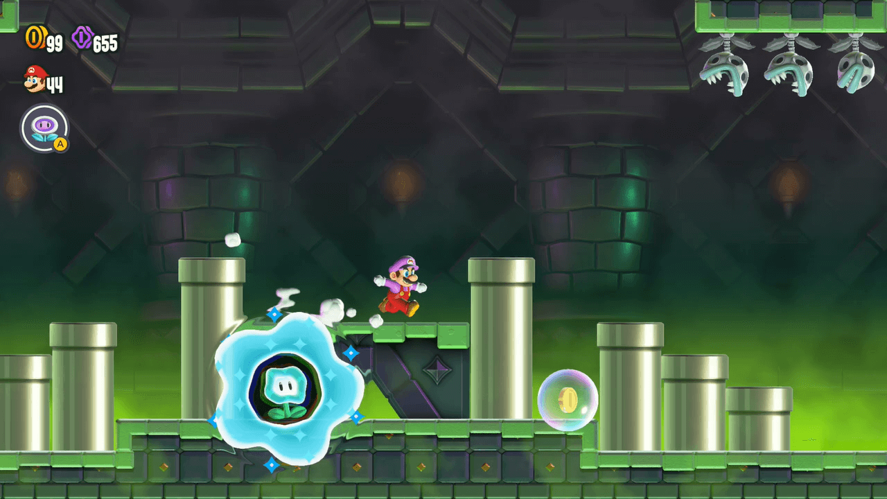 Lorsque vous attrapez la fleur prodige, faites demi-tour. Vers le début du niveau, abaissez-vous pour faire tomber un bon nombre de pièces fleurs.
