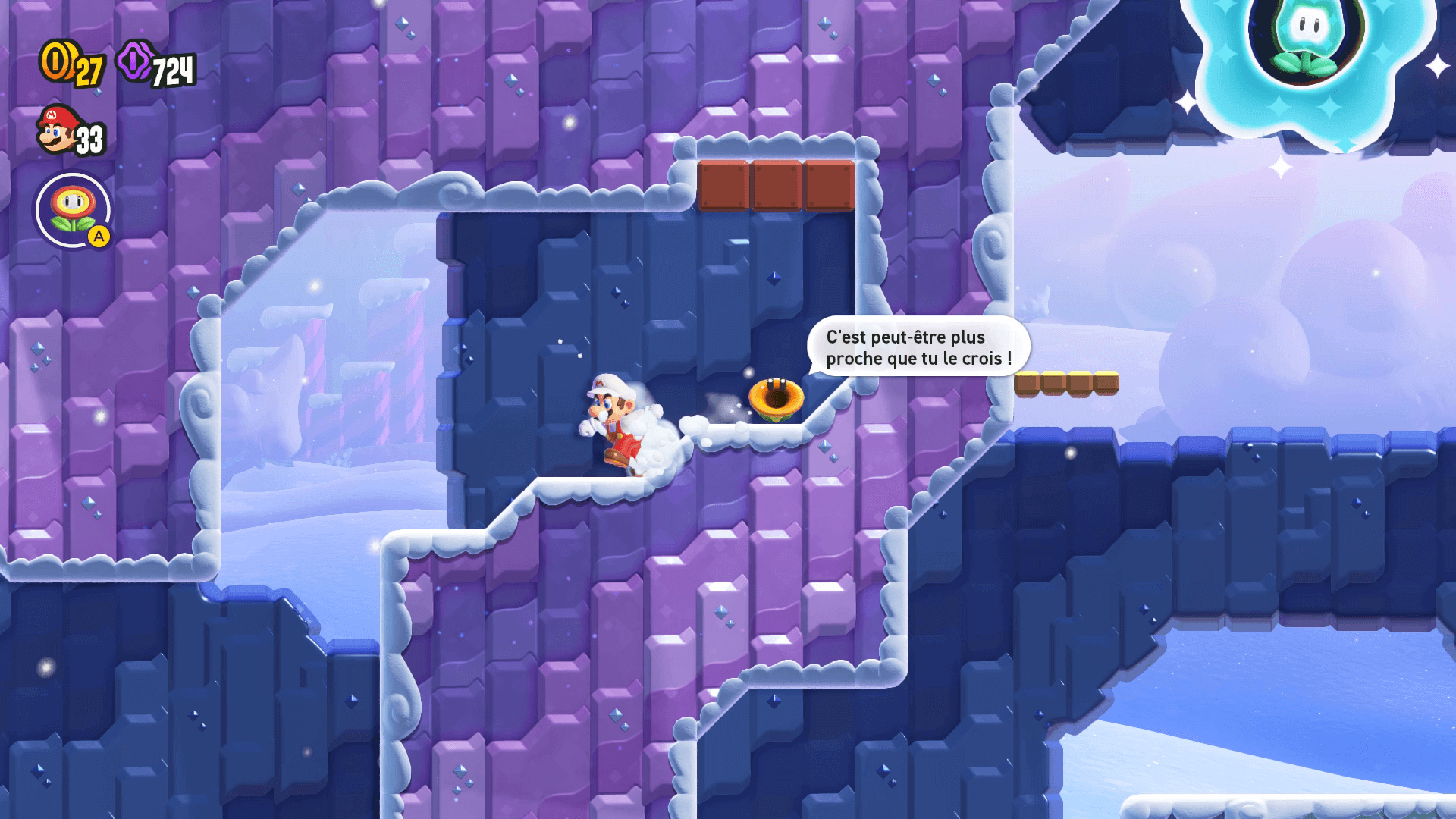 Bien après le drapeau de mi-niveau, vous verrez trois Pikdors attaquants vers le bas avec, à côté, deux autres Pikdors attaquants à l'horizontal. Rebondissez sur le plus haut pour atteindre la fleur prodige.