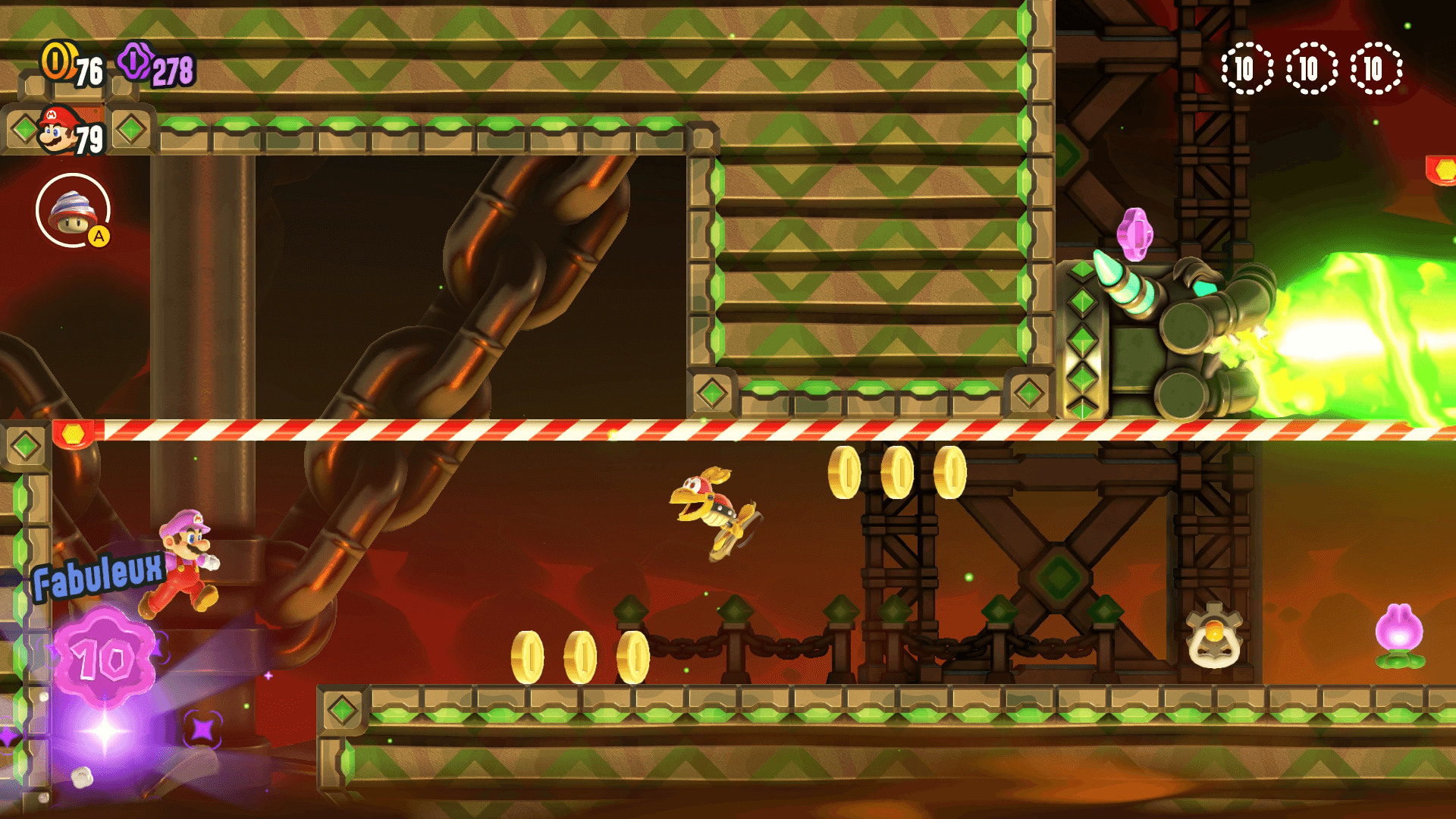 Comme toutes les fleurs prodiges des forteresses volantes de Super Mario Bros. Wonder, cette fleur fait apparaitre Bowser arrive (sous sa forme Bowser-château-volant). Ceci complique nettement le niveau !